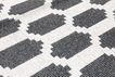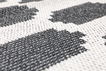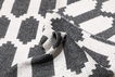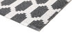 100% plastic where plastic straps are woven together and create rugs that are very durable and require minimal maintenance. Use mild detergent to remove any stains or wash at 30°C without any spinning cycle or tumble drying.